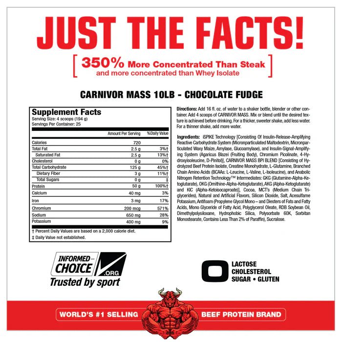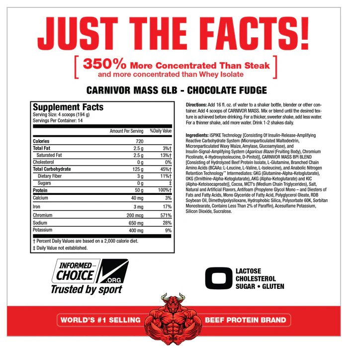CARNIVOR MASS is commonly referred to as โanabolic superfoodโ and is more advanced than the typical mass gainer. Where regular foods and typical gainers may be limited in terms of speed of absorption and the potential for insulin spiking, CARNIVOR MASS excels. It combines a unique hydrolyzed Beef Protein Isolate (BPI) with a dual-action insulin signal amplifying technology known as iSpike. The combination of BPI and iSpike act in tandem to support improved muscle anabolism while minimizing fat storage. CARNIVOR MASS is a fast, clean and highly anabolic gainer. Welcome to a new era in mass building supplementation with CARNIVOR MASS, the fast, clean, highly anabolic mass gainer!